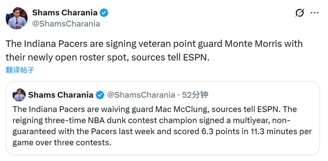 北京时间11月7日,据名记Shams报道,步行者队将裁掉麦克朗,并签下蒙特-莫里斯。步行者队记Dopirak透露,莫里斯将签下一份为期一年的非保障合同。
