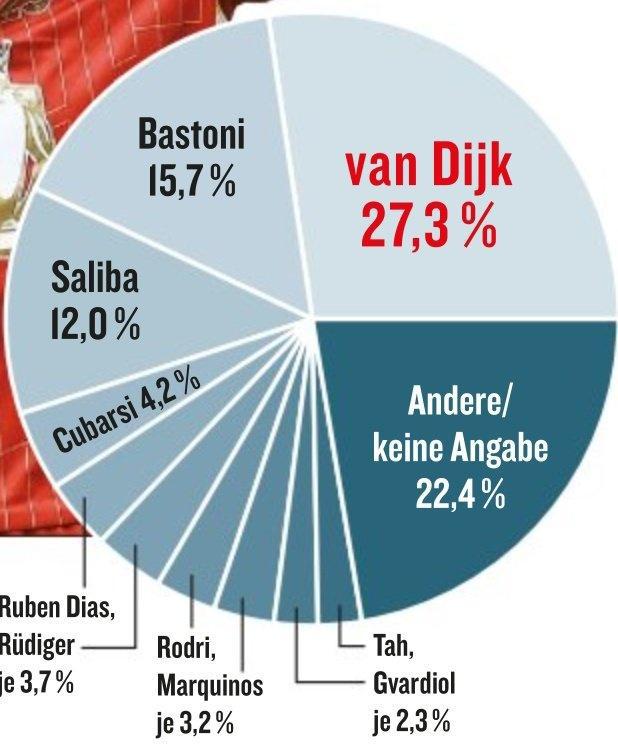德甲球员选世界最佳防守球员,范迪克、巴斯托尼、萨利巴分列前三